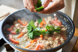 鶏肉に火が通ったら、青じそ8枚をちぎり入れ、さっと炒める。