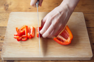 パプリカは横半分、縦5mm幅、玉ねぎ、にんにくはみじん切りにする。
