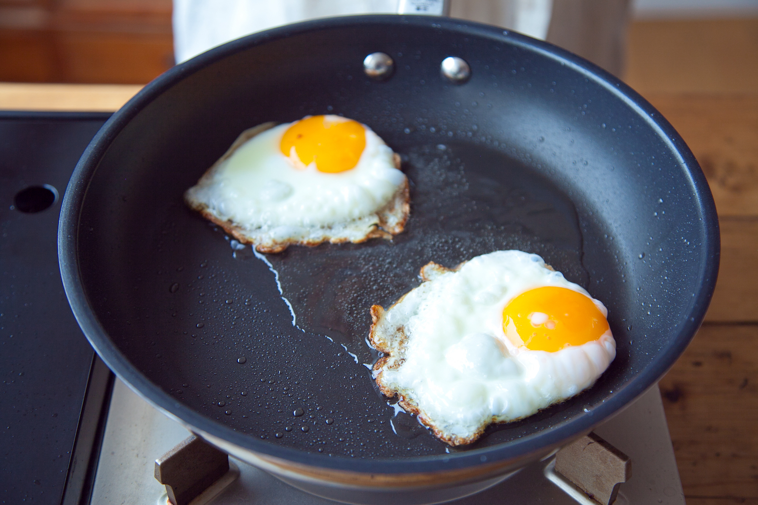 フライパンにサラダ油を中火で熱し、卵を入れ、目玉焼きを2個つくり、一度出しておく。