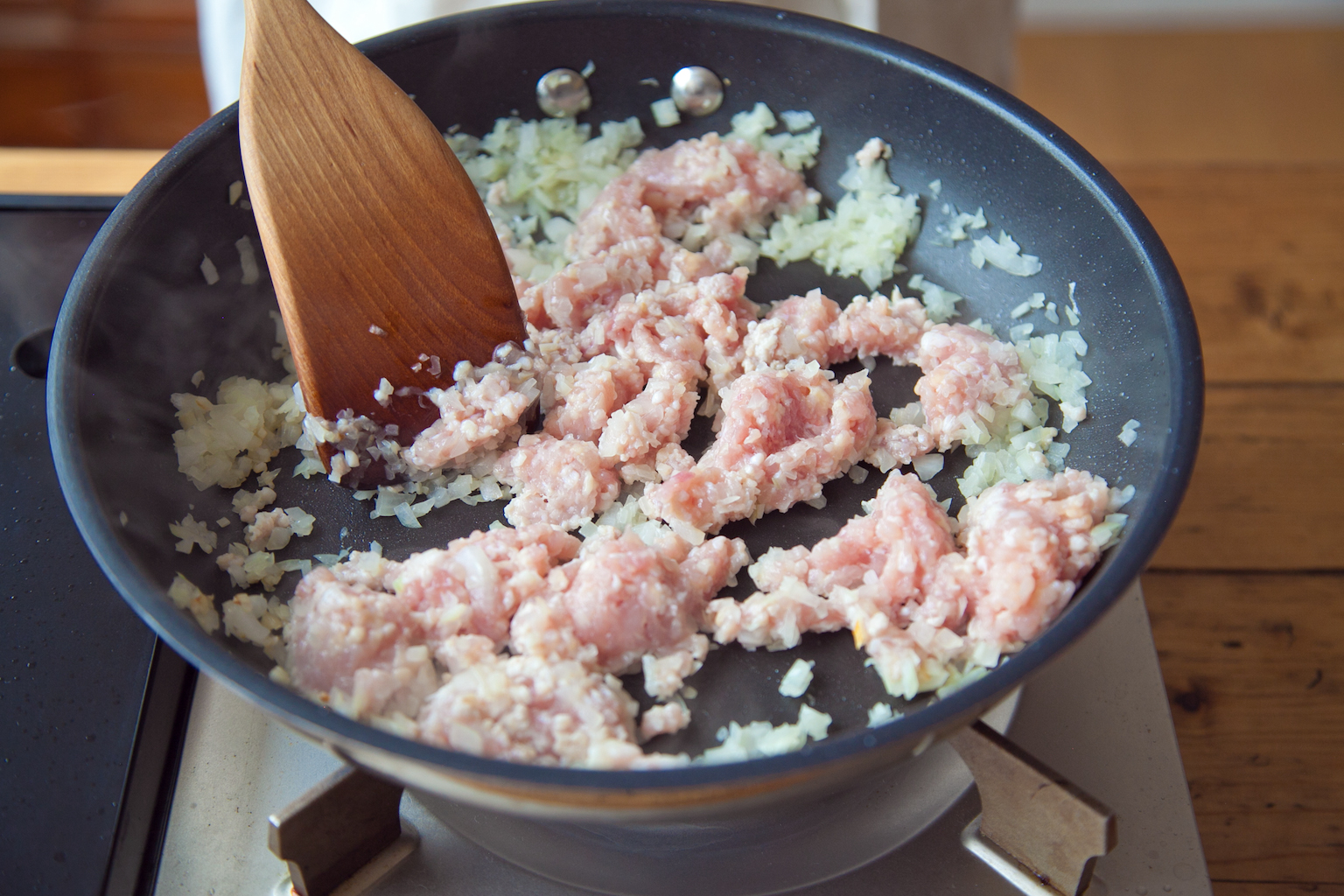 (※ひき肉の塊が残るように潰しすぎないようにします。)