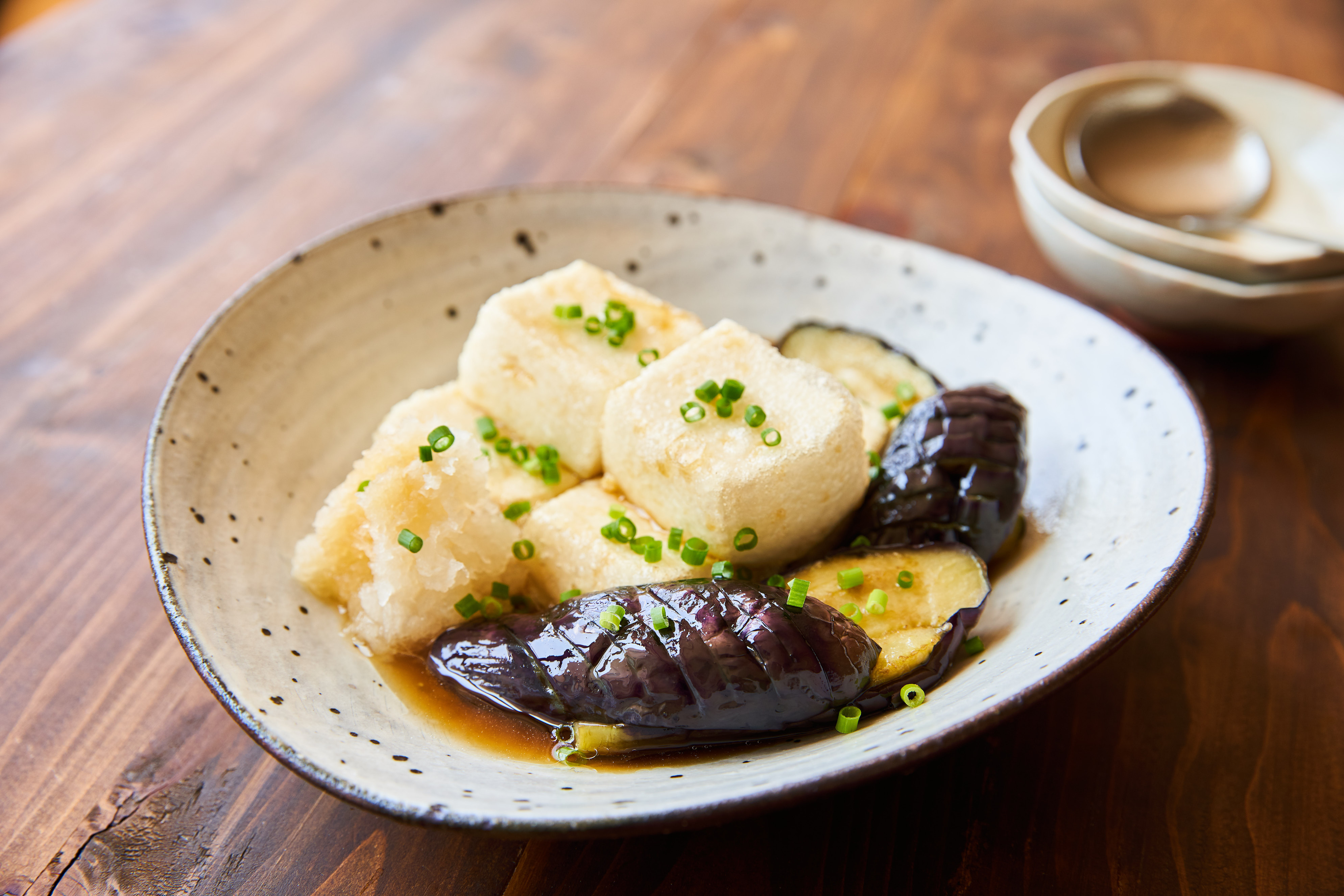 秋においしくなるなすとやわらかな絹ごし豆腐を合わせて揚げ出しにしました。
