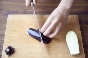 なすは縦半分に切り、皮目に切り込みを入れる。
