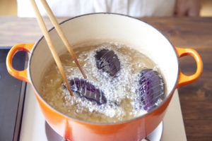 揚げ油を170度に熱し、なすを皮目を下にして入れる。途中上下を返して2〜3分揚げ、なすが柔らかくなったら、つゆの入った鍋に加えておく。