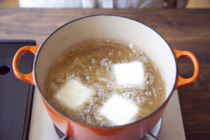 1の豆腐に片栗粉をまぶし、2と同じ揚げ鍋で3分ほど揚げる。