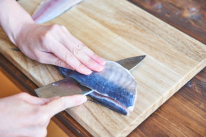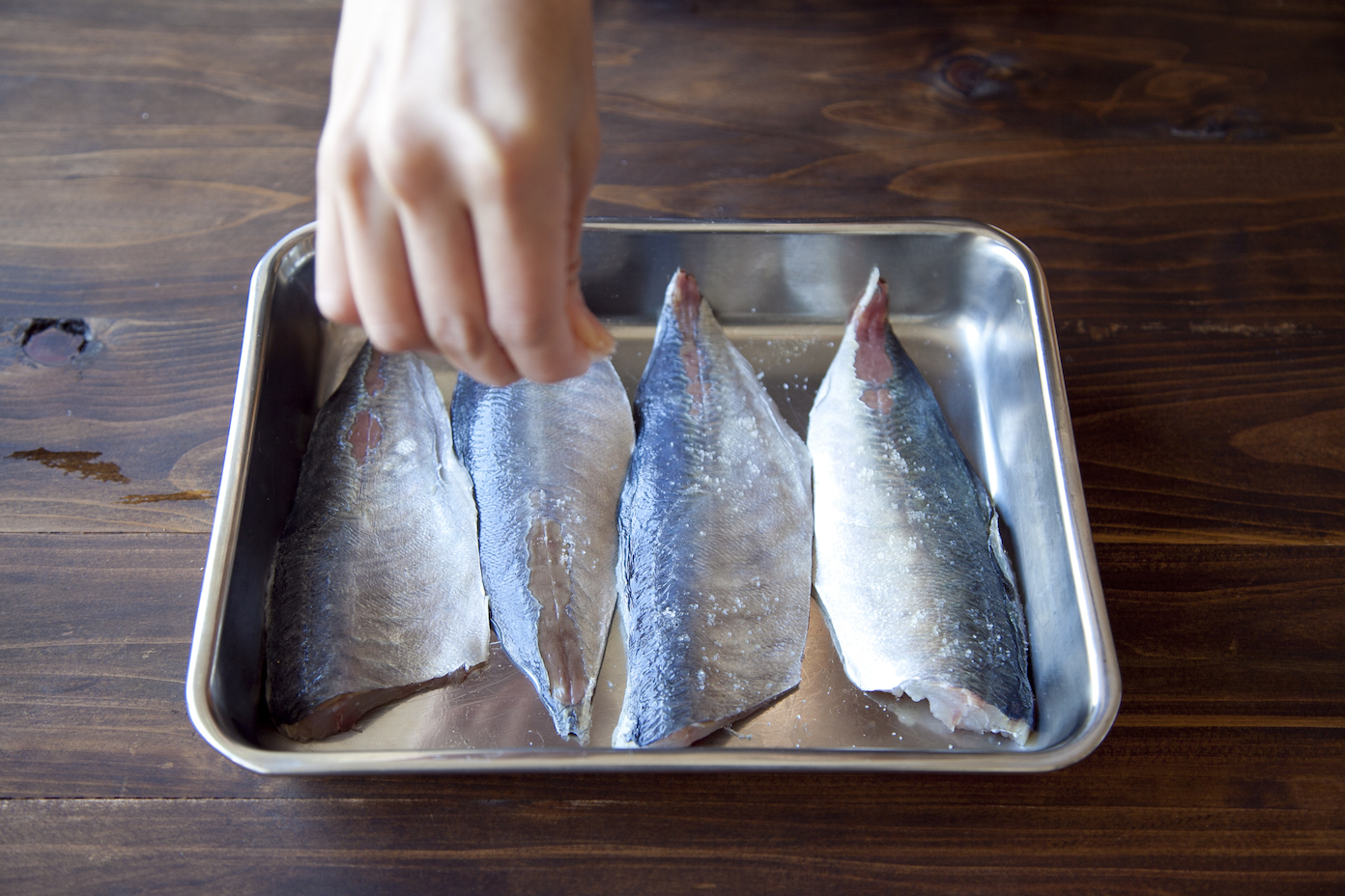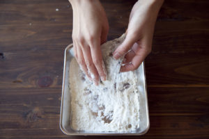 薄力粉をアジの全体につけ、余分な粉ははたいて落とす。