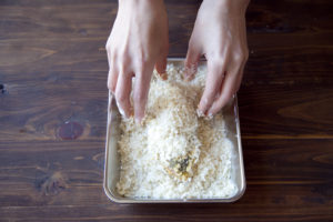 (※パン粉はたっぷり使います。アジ全体にふわりとつけ、おさえるようにします)