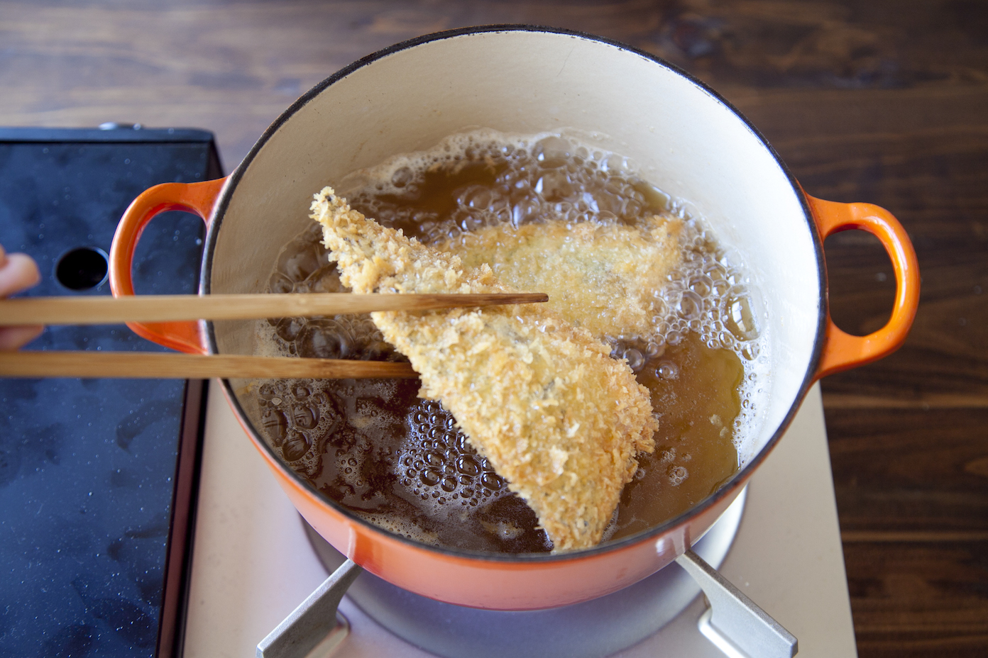 揚げ物は夫婦で小麦粉をつける人、溶き卵とパン粉をつける人と分担するとスムーズですよ。