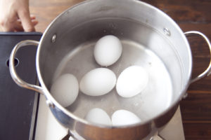卵が茹で上がったら氷水に入れて3分以上冷やし、殻をむく。