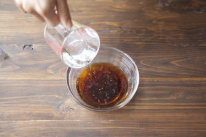 アルコールをとばす。 しょうゆ、かつお節、水1/2カップを加え混ぜる。