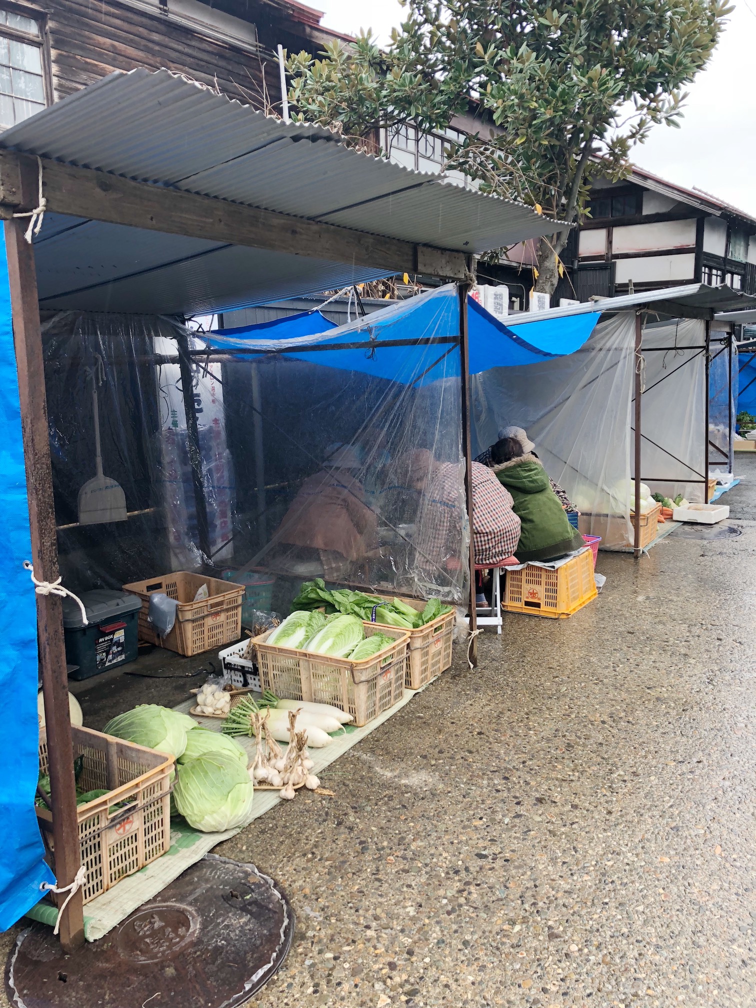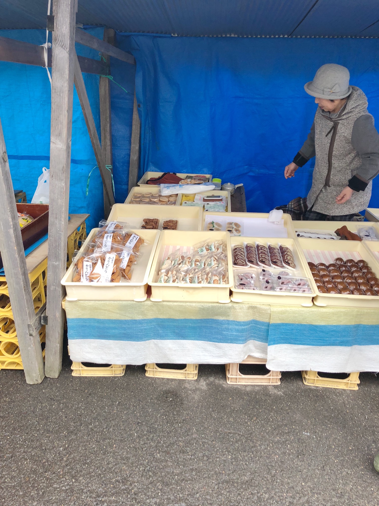 野菜やお花のお店が並び、お惣菜やおまんじゅうのお店も少しありました。