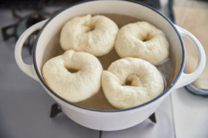 ベーグルの上面を下にして鍋にいれて1分茹で、上下を返してを1分茹でる。