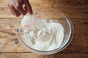 ボウルに強力粉、塩を混ぜ、中心をくぼませてドライイーストをいれ、イーストめがけて1を加える。