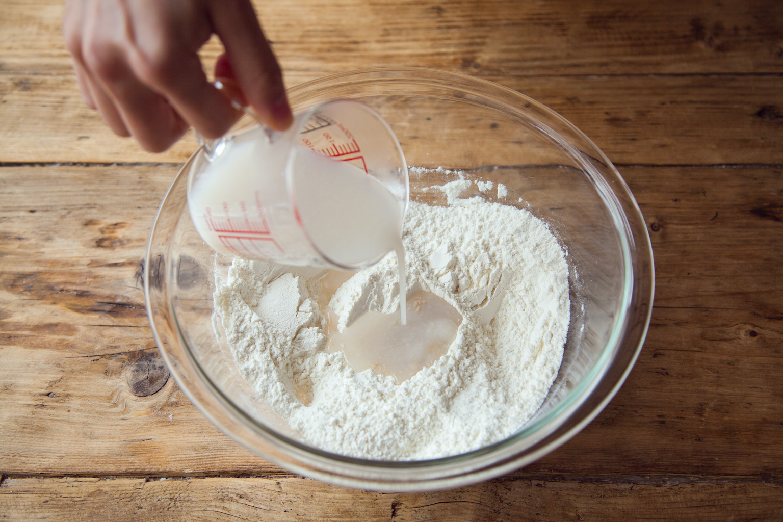 ボウルに強力粉、塩を混ぜ、中心をくぼませてドライイーストをいれ、イーストめがけて1を加える。