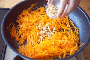 油がまわったら(A)を加えて炒め、汁気がなくなったらくるみを加え混ぜる。