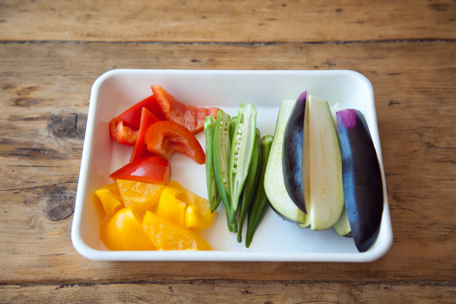 パプリカは乱切り、おくらは硬い部分を切り取って縦半分、