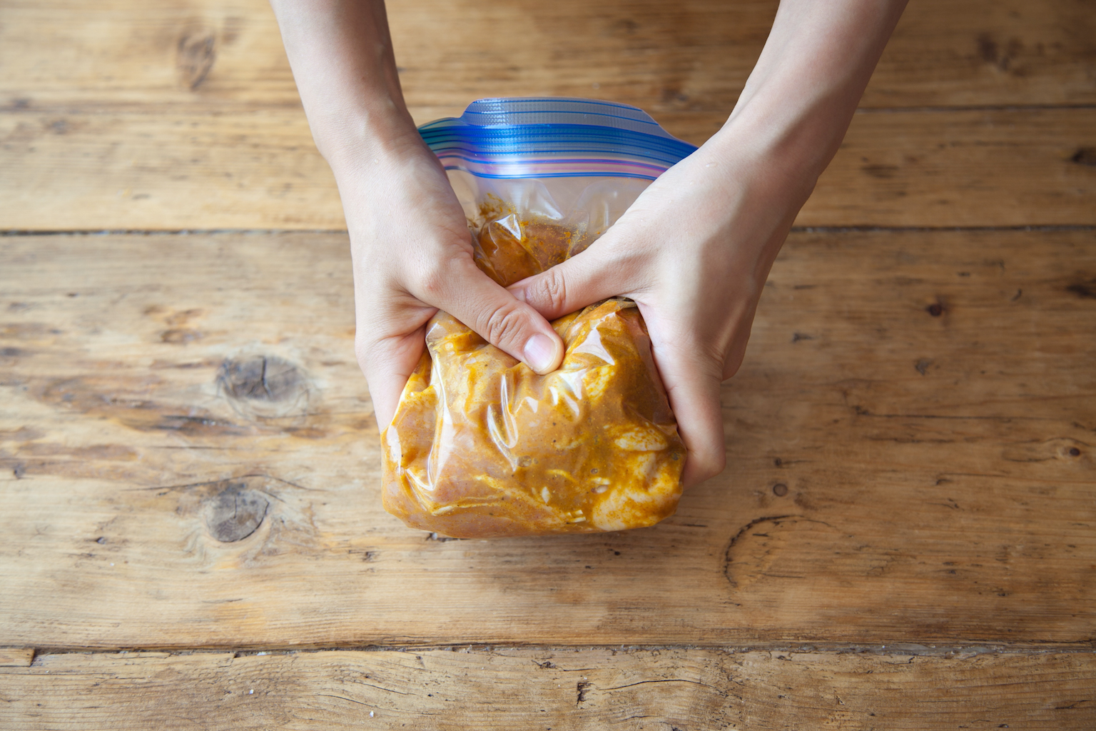 鶏肉は一口大に切り(A)を揉み込みジッパー付き保存袋に入れ、