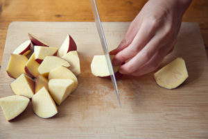 さつまいもは小さめの乱切りにする。水に10分ほどさらし、水気をしっかり拭き取る。