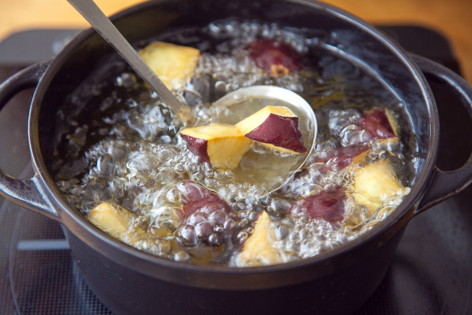 鍋に揚げ油を注ぎ、160度に熱する。さつまいもを加えて5〜6分、柔らかくなるまで加熱し、一度取り出す。