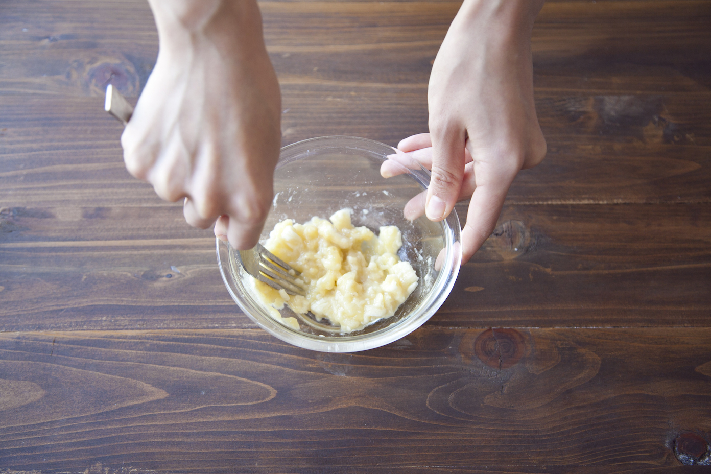 バナナは6枚スライスし、残りをフォークで粗く潰す。