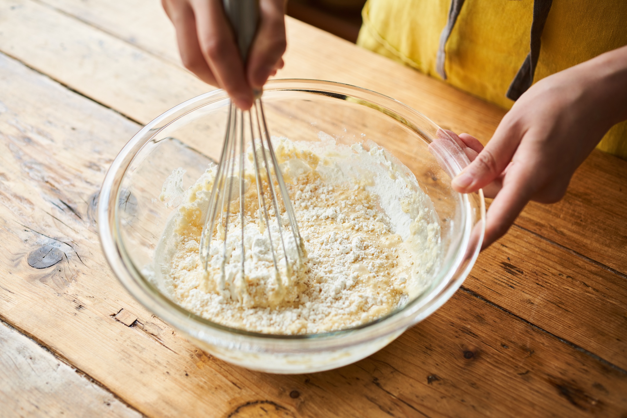 (※混ぜすぎると膨らみが悪くなるので、粉っぽさがなくなればすぐに混ぜるのをやめます)