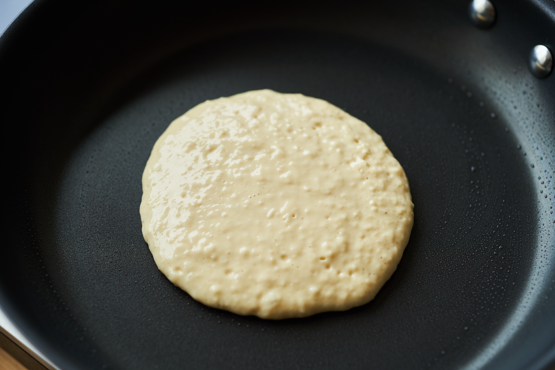 フライパンを戻し、弱火にかけて生地の1/4量を流し入れる。