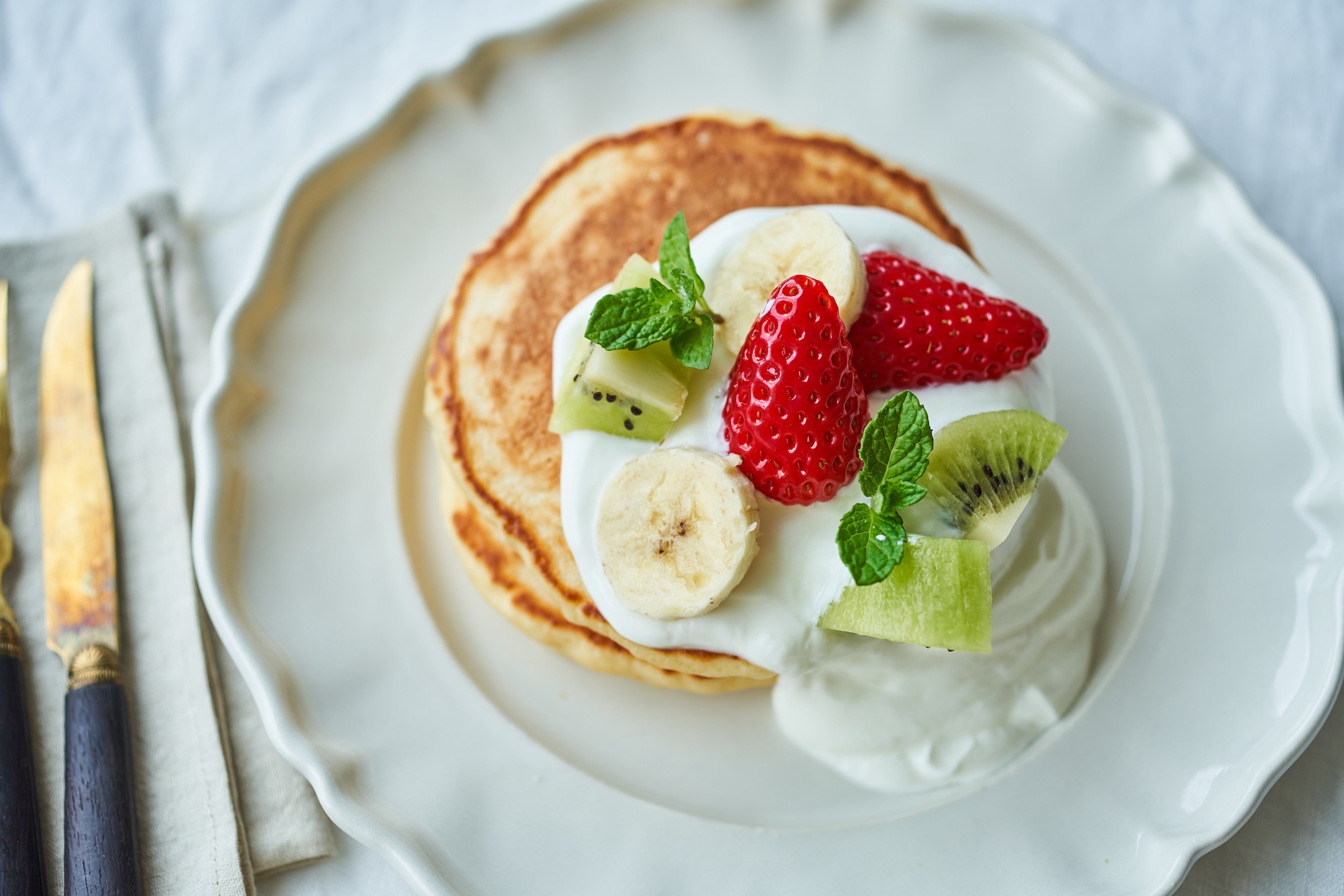 残りも同様に焼く。水切りヨーグルト、フルーツ、ミントをのせ、メープルシロップを添える。