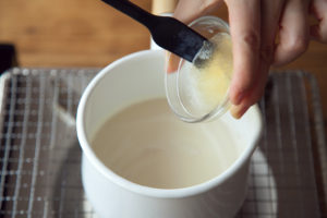 沸騰直前になったら火を止めてゼラチンを加え混ぜ、完全に溶かす。