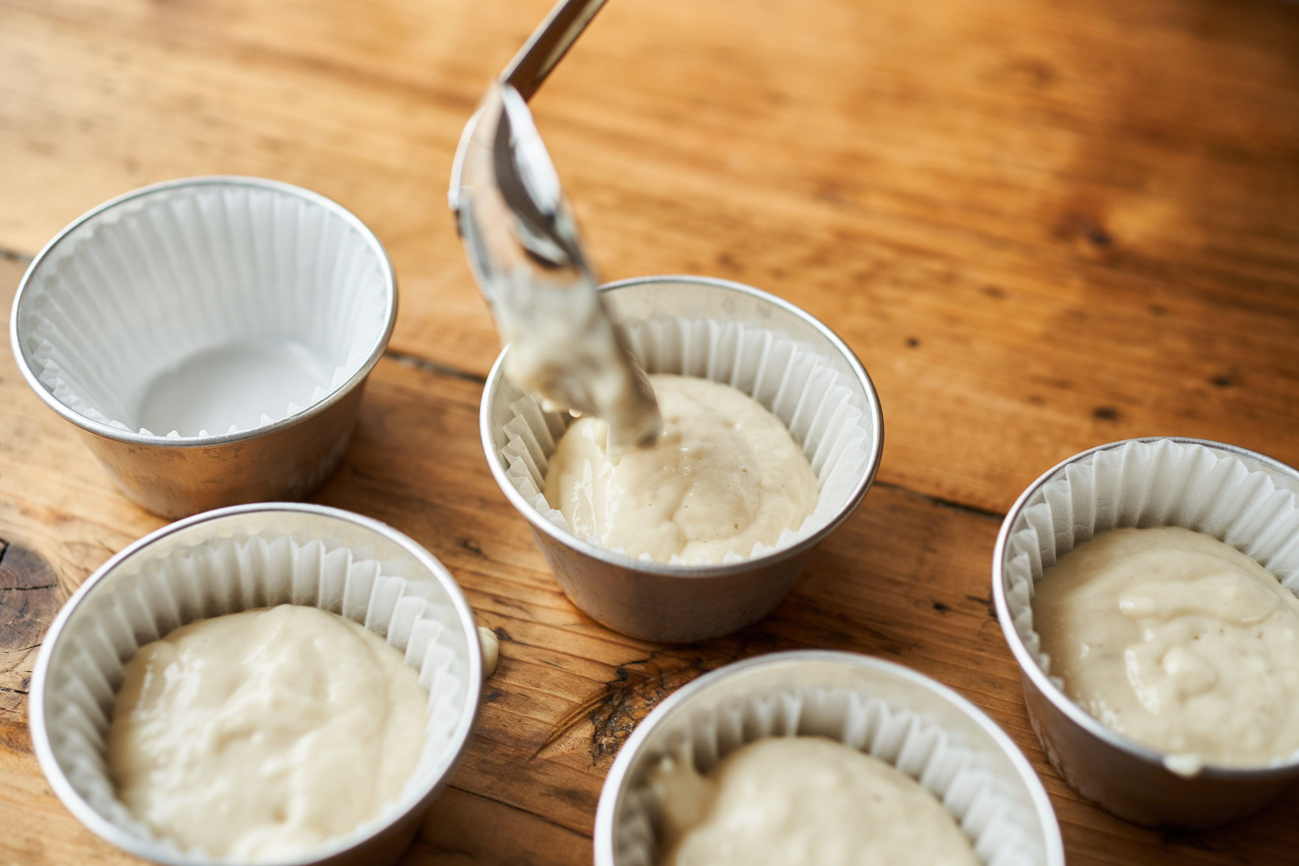 プリンカップに紙カップを入れ、生地を7〜8分目まで流し込む。