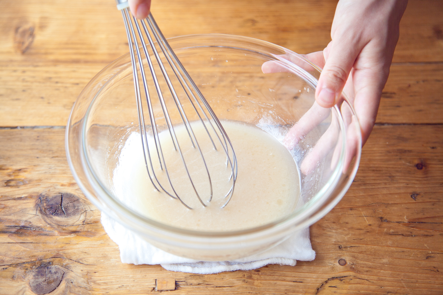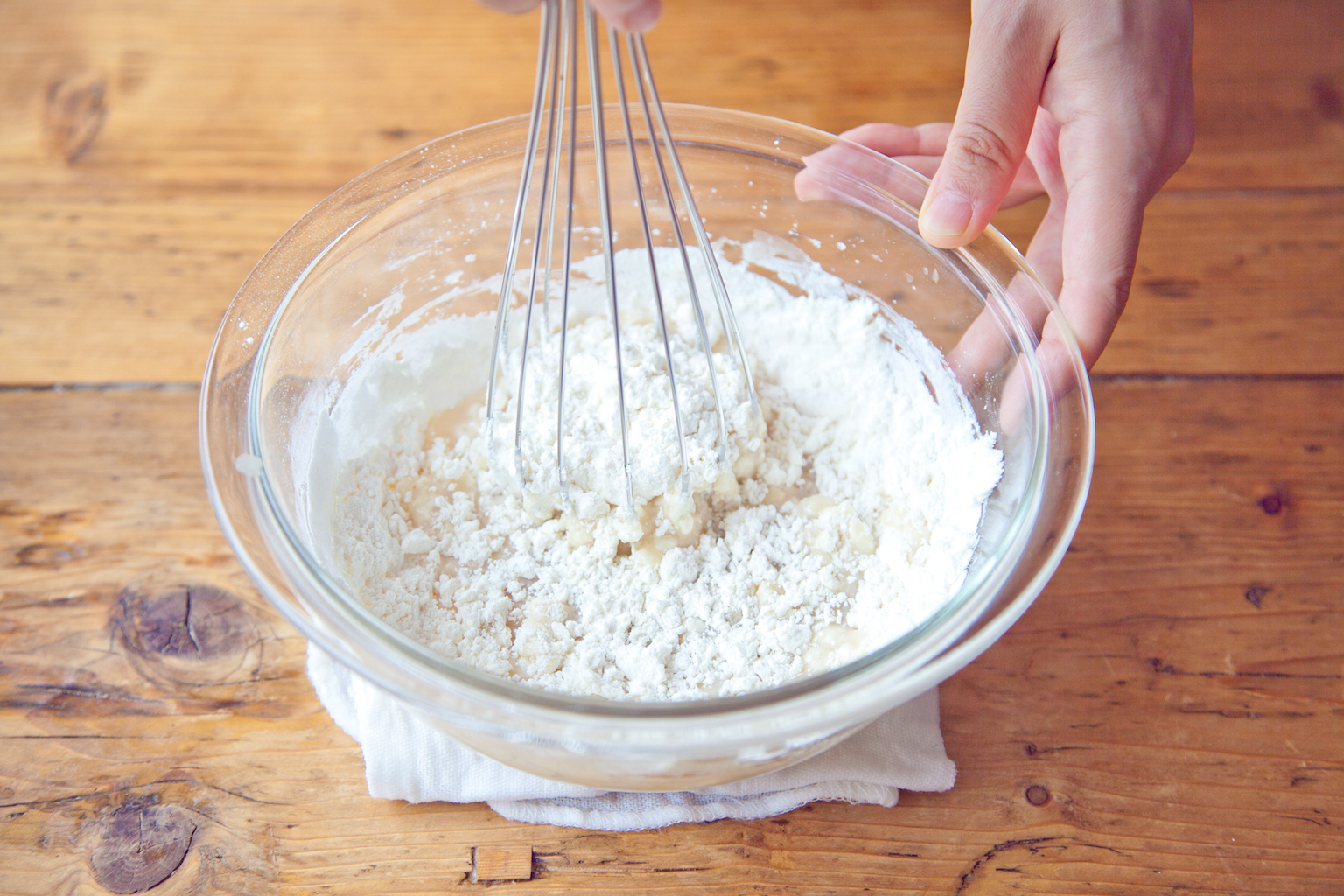 (A)を合わせてふるいいれ、ダマがなくなるまで、泡立て器で静かに混ぜる。