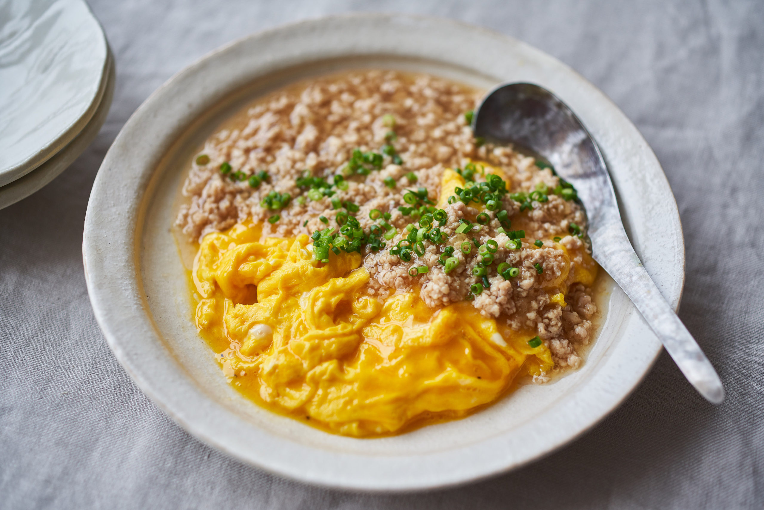 鍋にサラダ油小さじ1/2を中火で熱し、鶏ひき肉を炒める。