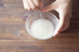 水大さじ2を電子レンジ600Wで30秒加熱し、粉ゼラチンを溶いておく。
