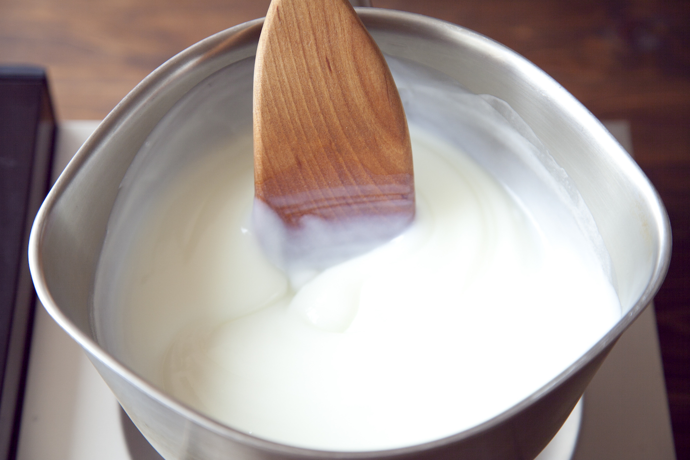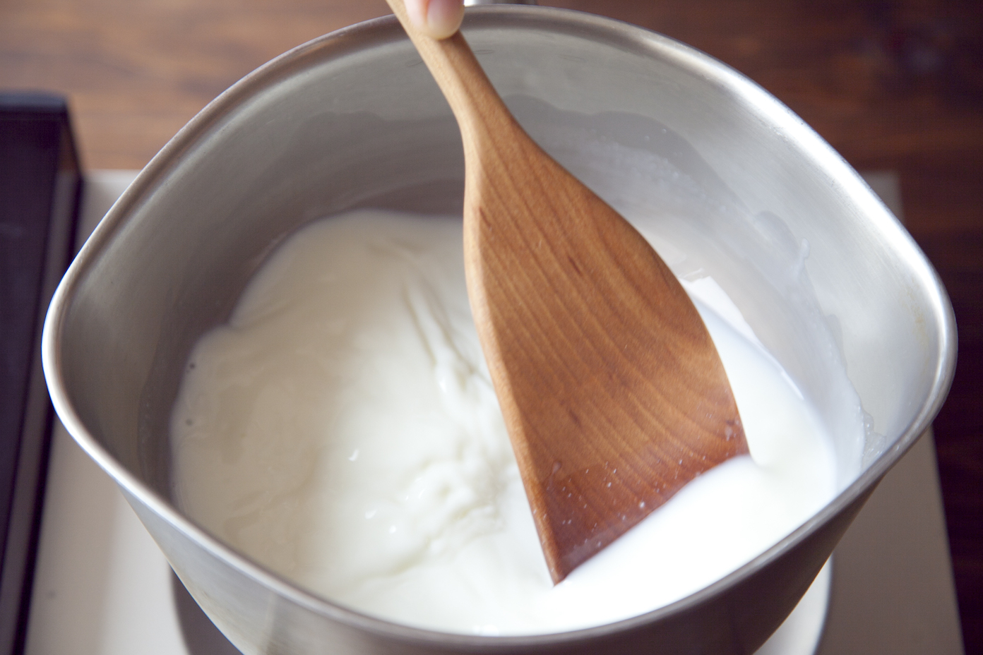 鍋に残りの牛乳、杏仁霜、砂糖を入れ混ぜて中火にかけ、混ぜながら加熱する。温まったら1の牛乳を加え、常に鍋底から混ぜながら加熱する。