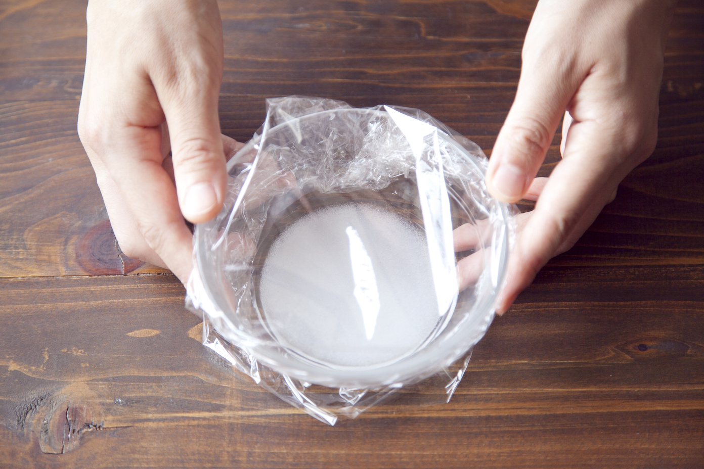 ふんわりとラップをかけて電子レンジ600Wで1分半加熱しよく混ぜ、シロップをつくり、冷やしておく。
