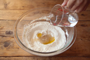 指に小麦粉適量をつけて生地に穴をさし、指を抜いて残っている状態になればOKです。