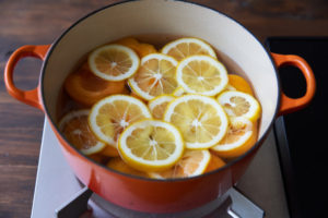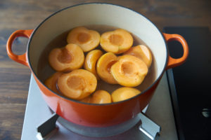 鍋に水3カップ、グラニュー糖を入れ、火にかけ、 煮立ったら弱火にし、あんずを入れて再沸騰したら火を止め、レモンを加える。