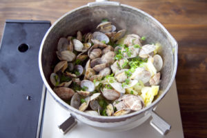 5分程度加熱してあさりの殻が開いたらしょうゆを回しかけ、万能ねぎを散らし、器に盛る。