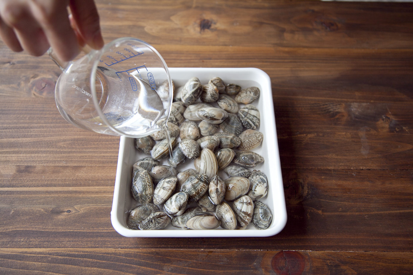 新聞紙等をのせて冷蔵庫で2時間以上おいて砂抜きをする。流水で殻をこするようにしてよく洗う。