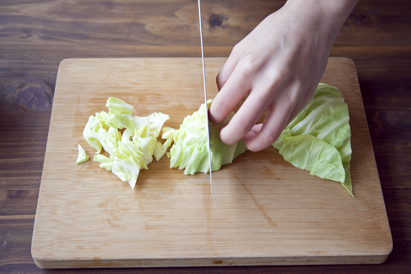 春キャベツは3〜4cm程度四方に、万能ねぎは小口切りにする。