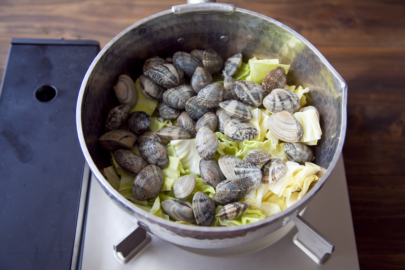 鍋に春キャベツ、あさり、酒を入れて蓋をして中火にかける。