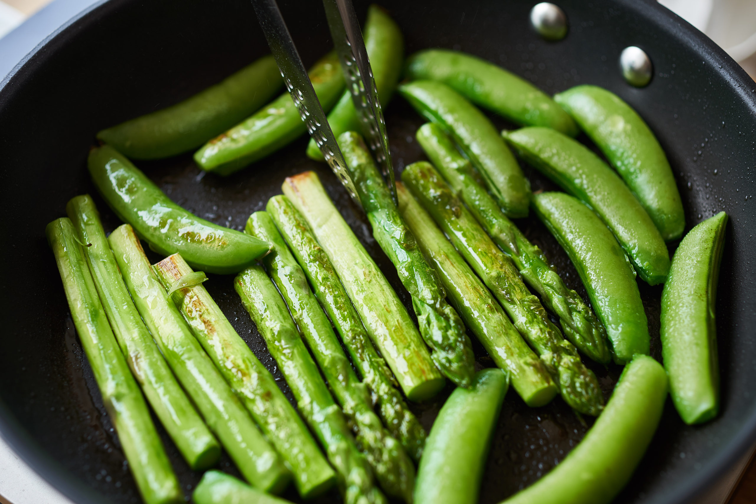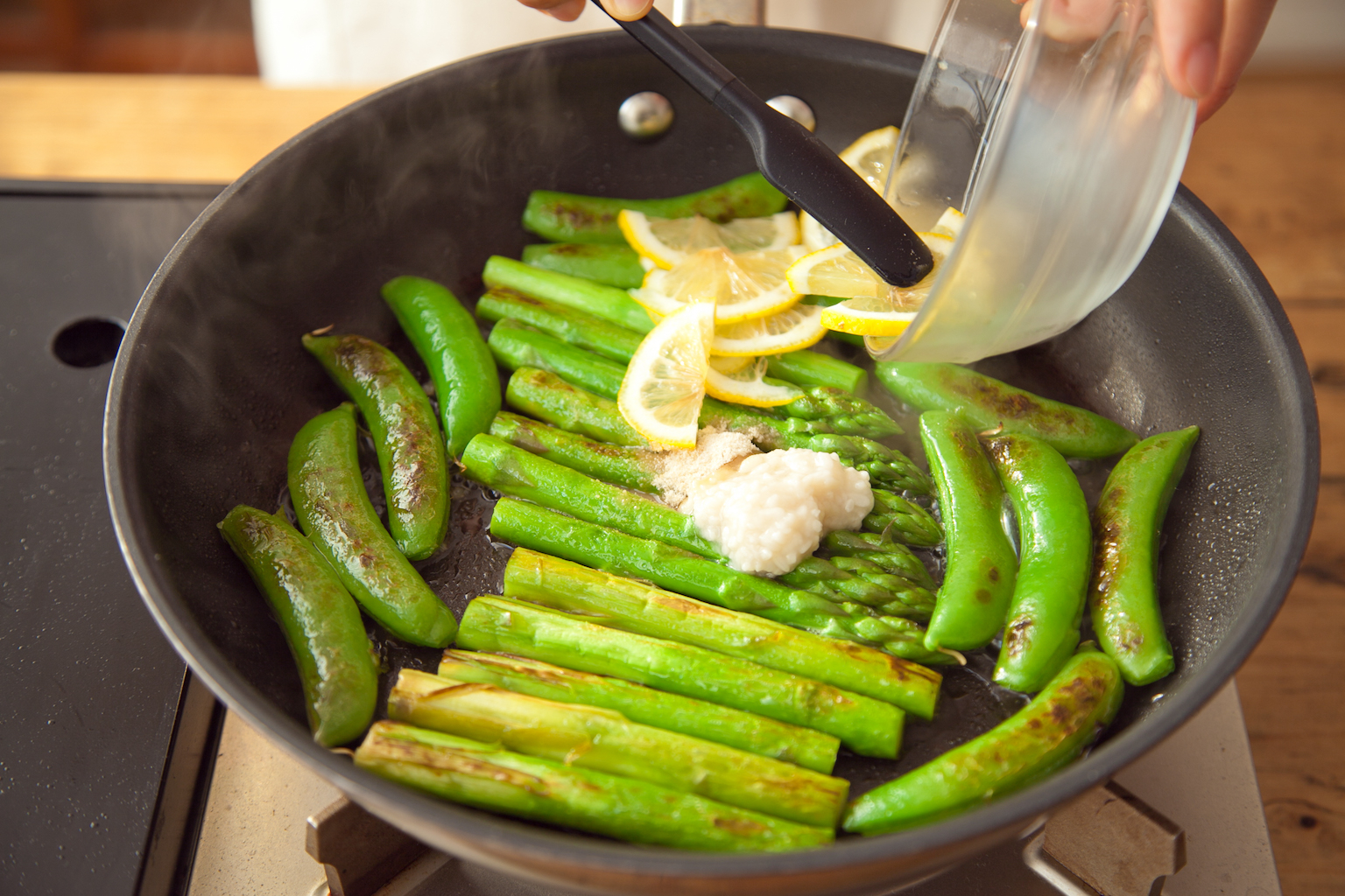 アスパラ、スナップエンドウを入れて1〜2分焼く。