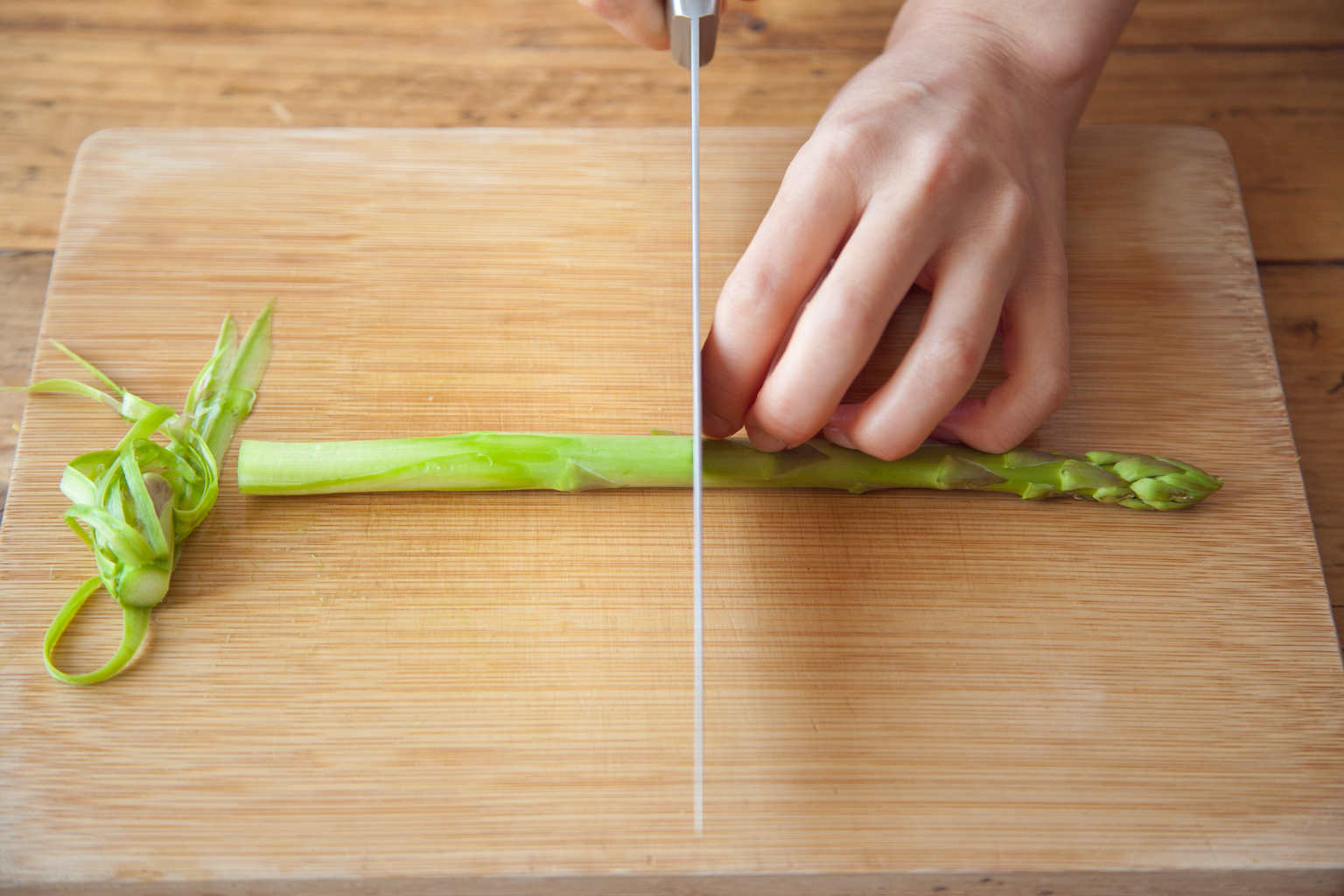 アスパラは根元から1/3ほど皮をむき、半分の長さに切る。