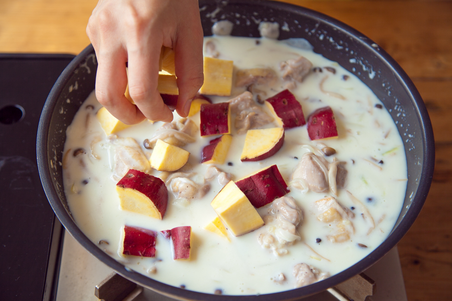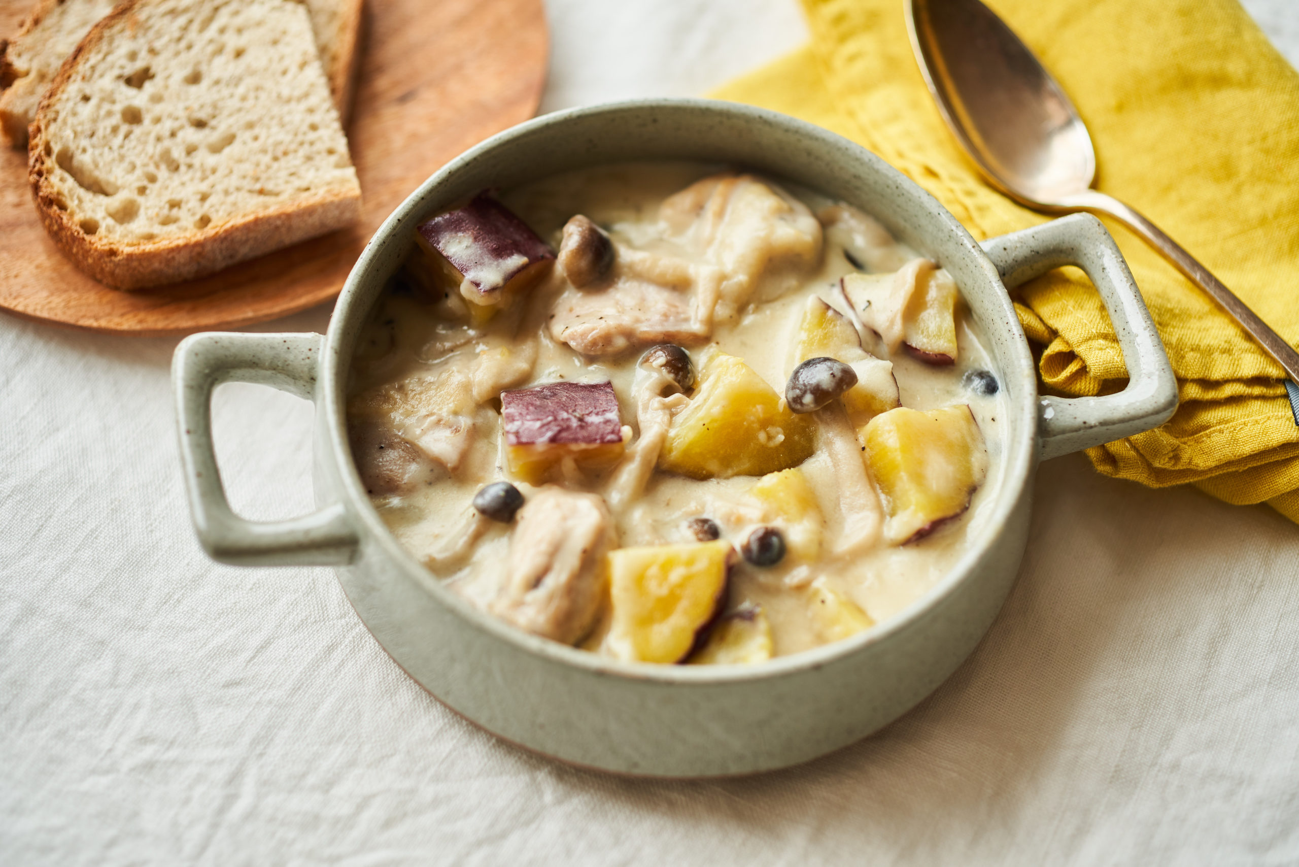 さつまいも、しめじ、鶏肉を使った、秋野菜と鶏肉のみそシチューの作り方です。