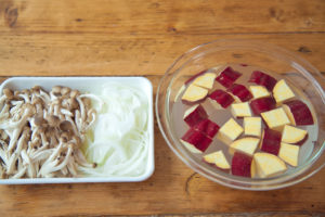 玉ねぎは縦薄切り、しめじは石づきを取り除いて手でほぐす。