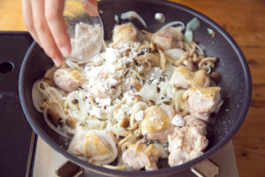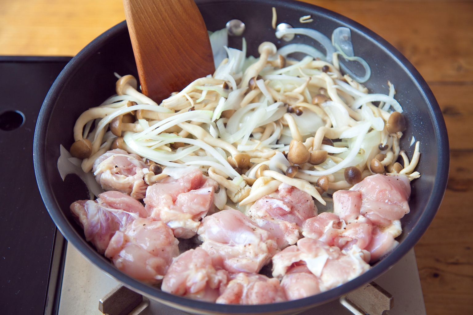 玉ねぎに透明感が出てきたら鶏肉の上下を返して全体を炒め合わせ、薄力粉を加えて炒める。