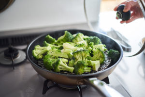 足つきの網などをおき、ブロッコリーを入れる。