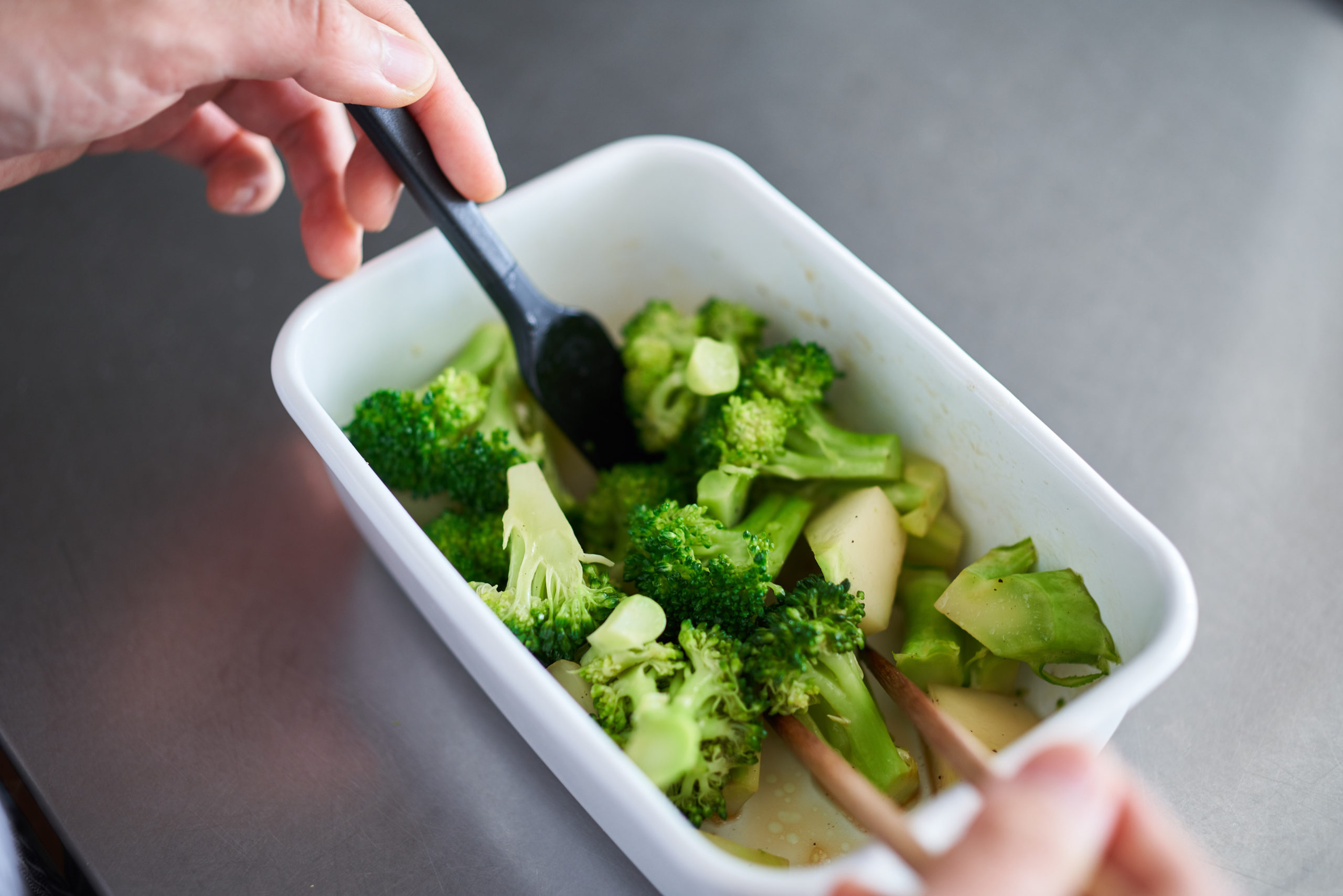 【3】2〜3分蒸したら大人用ブロッコリーを取り出し、熱いうちに(A)と和える。