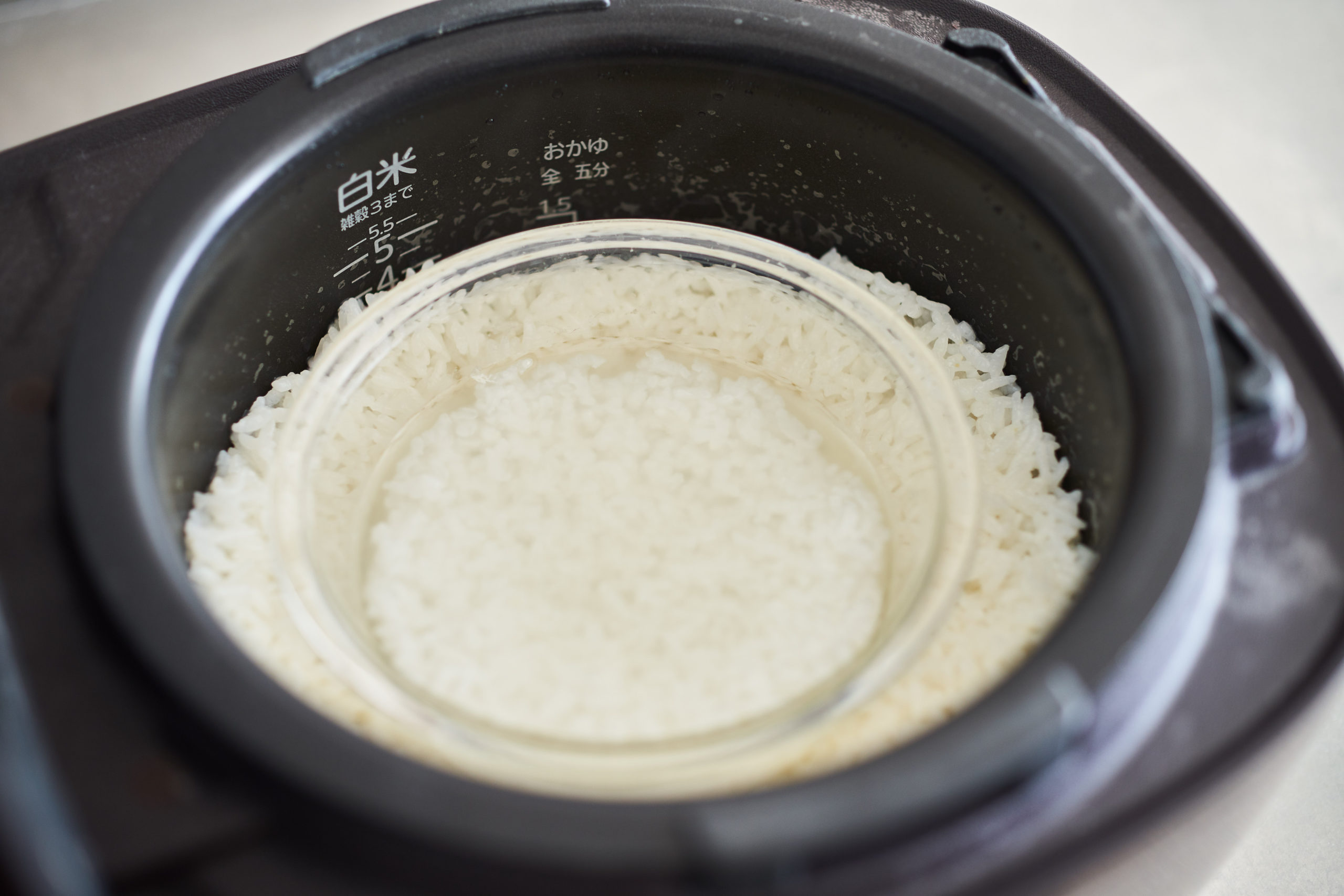 【1】炊飯器の内釜に米(大人用)、2合の目盛りまで水を入れる。