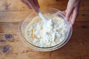 粉っぽさがなくなったら型に流し入れ、型ごと数cm上から落とすようにして空気を抜く。