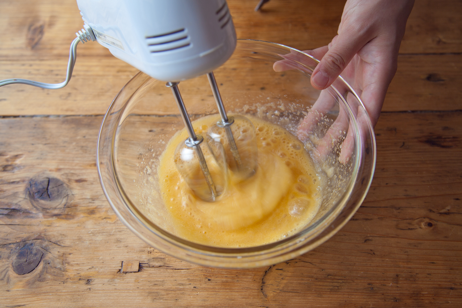 ボウルに(A)を入れ、ハンドミキサーで 2 分ほど混ぜる。
