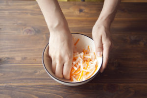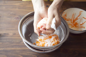 大根、にんじんを合わせて塩で揉み、 キッチンペーパーで包みながらしっかり水気を絞り、(A) と合わせて10分おく。